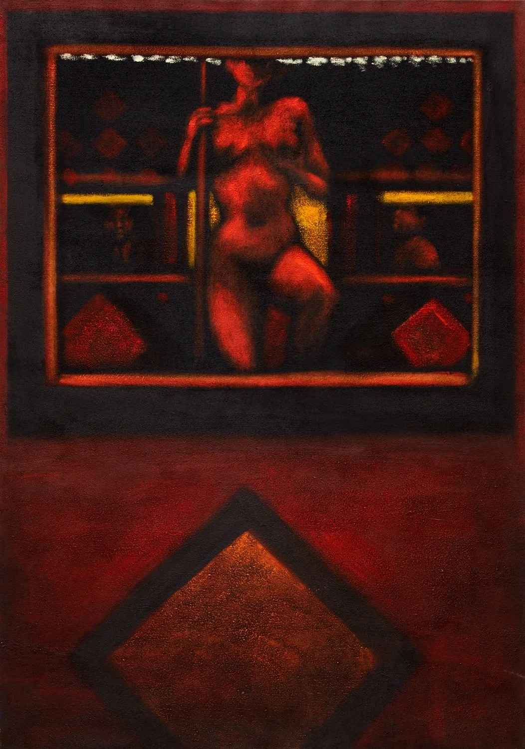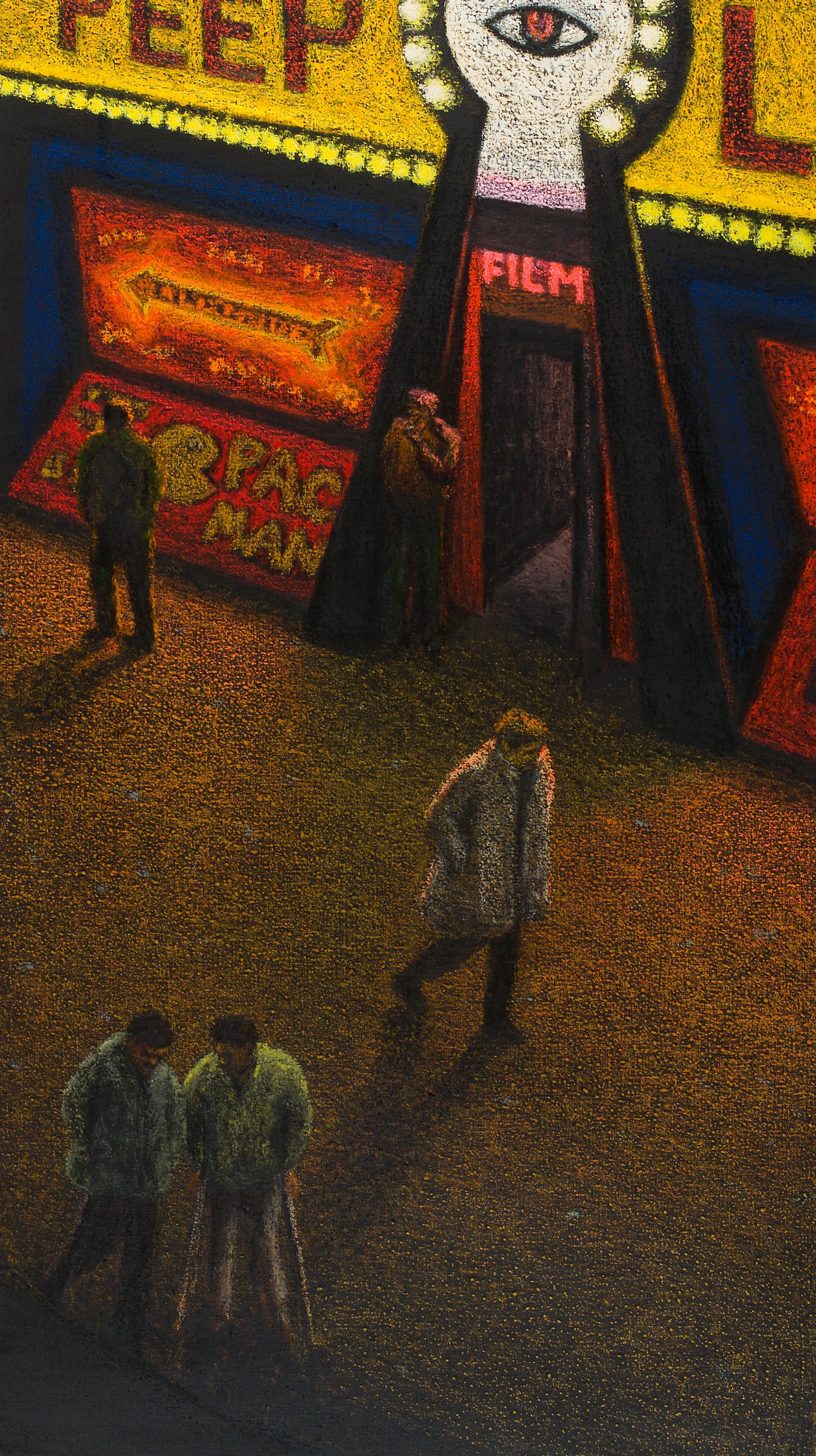 Peepland Conversation, 1988, oil on linen, 53 x 30 inches