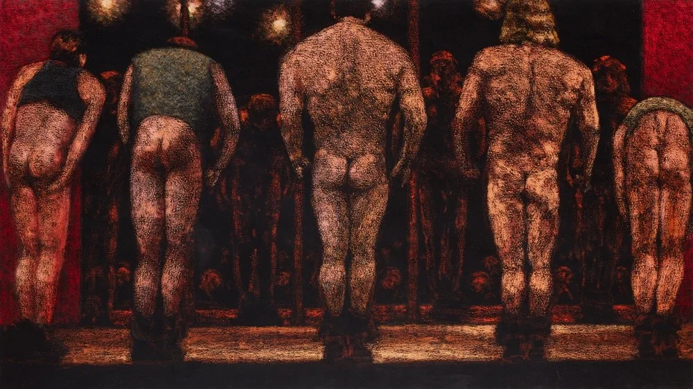 Chippendales, 1993, oil and granular gel on canvas, 69 x 123 inches