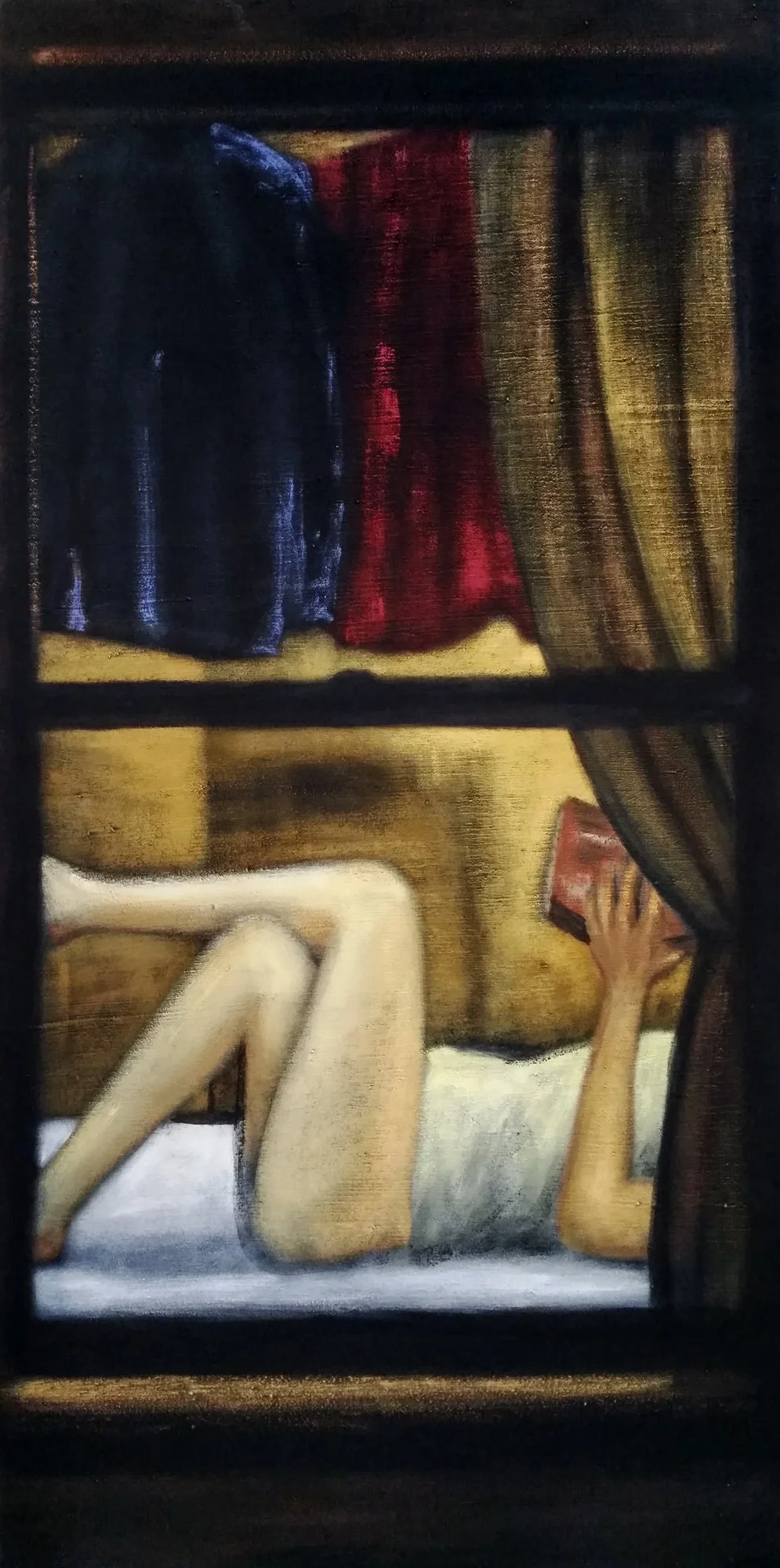 Witness Reading in Bed, 1991, oil on canvas, 70 x 35 inches